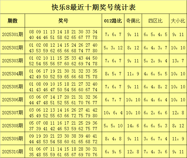 福彩快乐8第2025310期开奖回顾:01 06 07 11 14 15 18 28 30 31 35 48 55 59 61 65 67 69 70 76,其中奖号012路比为6:9:5,四区比为7:4:3:6奇偶比为12:8,大小比为9:11。